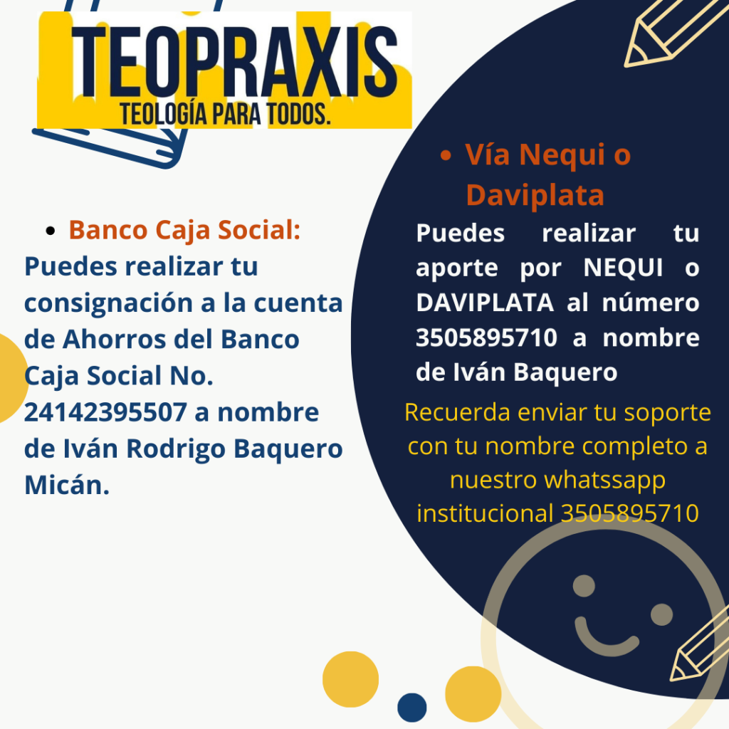 Este proyecto de Teopraxis, surge del amor a la experiencia de Dios y a la necesidad de compartirla con los demás, bajo un enfoque académico y crítico. Es el producto de muchos años de estudio formal en Colombia y no formal en Argentina, así como de un proceso de búsqueda e investigación que nunca termina. Si deseas apoyar este proyecto, porque valoras el esfuerzo y dedicación que hay detrás de él, no dudes en colaborarnos.